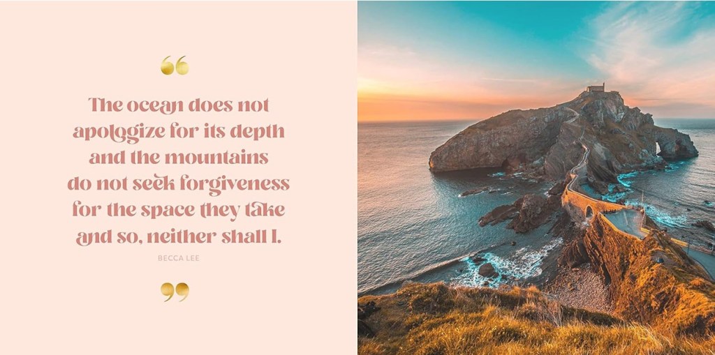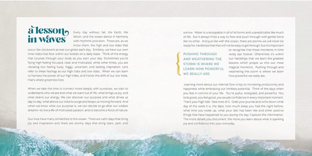 It’s also absolutely gorgeous. Every page is thoughtfully designed with ocean photography, pastel palettes, and simple fonts that feel airy and elegant. I could see it being used as a journaling prompt, a moment of peace in a busy day, or a mindfulness tool you return to again and again.